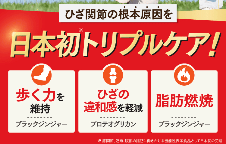 1)本品は機能性表示食品です。届出番号:G5162)届出表示:本品にはブラックジンジャー由来ポリメトキシフラボン及びサケ鼻軟骨由来プロテオグリカンが含まれます。ブラックジンジャー由来ポリメトキシフラボンは、年齢とともに低下する脚の筋力に作用することにより、中高年の方の歩く力を維持することが報告されています。ブラックジンジャー由来ポリメトキシフラボンは、日常活動時のエネルギー代謝において脂肪を消費しやすくする作用により、BMIが高め(BMI24以上30未満)の方の腹部の脂肪(内臓脂肪及び皮下脂肪)を減らす機能があることが報告されています。サケ鼻軟骨由来プロテオグリカンには、膝関節の不快感を持つ方の軟骨成分の分解を抑え、関節軟骨の保護に役立ち、膝関節の可動性、日常生活における膝の動き(階段の上り下り、歩く、立ち上がる、落ちたものを拾う、座っている)の改善に役立ち、起床時の膝の違和感を軽減することが報告されています。3)食生活は主食・主菜・副菜を基本に、食事のバランスを4)国の許可を受けたものではありません5)本品は疾病の診断・治療・予防を目的としたものではありません